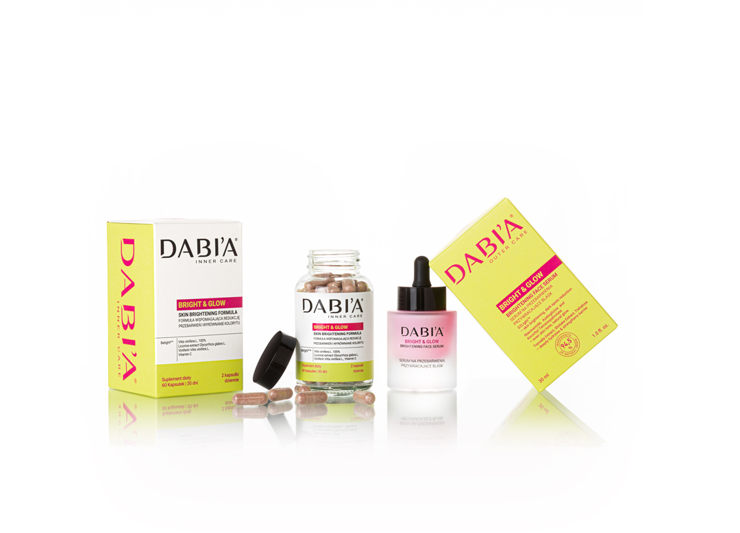 Zintegrowany program redukcji przebarwień: suplement diety Dabi’a Bright& Glow Skin Brightening Formula oraz serum depigmentacyjne Dabi’a Bright& Glow Brightening Face Serum. Nowe podejście do problemu przebarwień: od rozjaśniania zmian do regulacji mechanizmu melanogenezy. INNER: nutraceutyk z kompleksem Belight³ (Activ’Inside); systemowa regulacja melanogenezy i środowiska oksydacyjnego. OUTER: serum oparte na G2Light (Roelmi HPC) — redukcja intensywności plam do –59,2%; miejscowa kontrola transferu melanosomów i odnowy naskórka.